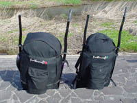 | ■収納 フェザークラフトの収納バックはとても優秀、3wayになっています。(現在ではアルフェックも3wayバックを採用しています) 右の写真、左側がK1です(右側はK-Light)かなり余裕がありますので、公共交通機関を利用してのキャンプなどは、PFD、着替え等を一緒に詰め込むことができます。また、4分割予備パドルを常に収納しています。 パックカートも持っていますが、私は階段等でいちいち担ぎ直す事、段差を考えながら転がす事などが苦手で、もっぱら背負っておりました。 |