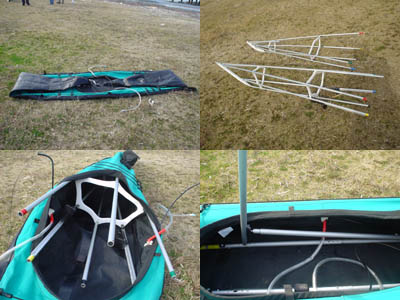■インプレッション(2)〜組立 説明書はイラスト付、勿論正規輸入品は日本語でついています。また、新艇であればビデオもついております。 モデルチェンジ後のK1 Exp.はパーツの数少なく(バウとスターンセクションはバンジーコードでつながっている為)、カサラノの組立てに慣れた身ですと、とても簡単に思えます。 しかし、慣れている事が原因の落とし穴も存在していまして・・・テンション掛けですが、2段階目の順番がカサラノと異なります(ちなみに、クロンダイクとも異なります)これを正規の順番通りで行うか否かによって、一番大変な作業、テンション掛けの効率が変わります(フェザー艇を複数所有する皆さん、一度確認してみてください) 最初の組み立て時には上記テンション掛けの問題と、船体布が縮んでしまっていた事が影響し、1時間半程度かかってしまいました(しかも手伝ってもらって)2回目からはさすがにそんなにかかる事は無く、30分程度がレギュラータイムになっています。 上記の通り、よく乾かさないで収納した場合など、船体布が乾燥時に縮み、次回の組み立てが大変になる時があります。そんな時は組立前に船体布を濡らします(特にコーミング周りは少し濡らすと随分楽になります)低温時はお湯をかけるのも有効です。 | ||
